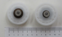 Gear idler has a plastic flange of 49.5mm diameter and a metal gear of 17mm diameter with 64 outer teeth and 15 inner teeth, bearings of 13mm.
